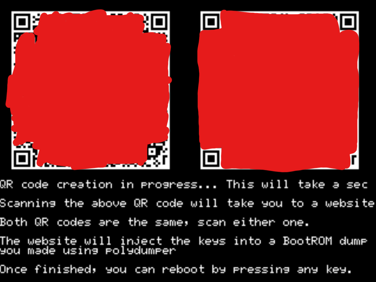 }After all keys are extracted, we can display the keys to the user. I have chosen to do this via a QR code, allowing the user to easily use a tool to inject keys into their keyless bootrom <insert link>
